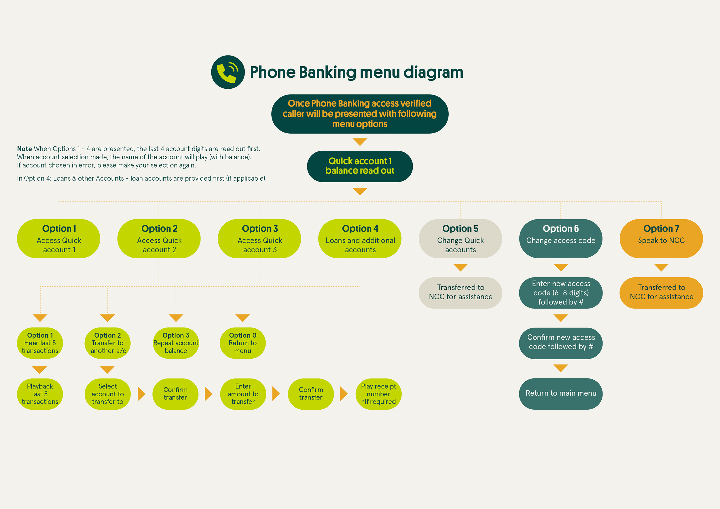 To help you use Phone Banking easily, we’ve created a handy Phone Banking menu diagram :